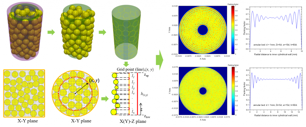 Abstract: The packing factor is an important parameter for describing the internal structural features in pebble beds, which have a significant influence on the heat and mass transfer behavior and the thermo-mechanical properties of the pebble bed. A comprehensive understanding of the packing structure is essential for the design and optimization of the pebble bed and can promote the application of the pebble bed. In this work, an improved line-based averaging method was proposed to calculate the local packing factor or local porosity distribution and validated by comparing the results with those obtained from experimental and numerical studies of cylindrical packed pebble bed. Furthermore, the local packing factor distributions in the angular-radial plane of the cylindrical pebble bed were revealed for the first time. In addition, the line-based averaging method has been applied to reveal the local packing factor distributions in the annular pebble beds, U-shaped pebble beds and hexagonal pebble beds. The main feature of this method is the ability to calculate and plot contour maps of local packing factor or porosity distributions for columnar pebble beds of arbitrary shapes, especially the local packing factor distributions in the cross-sectional plane and the angular-radial plane.